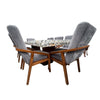 El Comedor de Ónix Hojas combina diseño artesanal, elegancia y calidez, ofreciendo un comedor único y sofisticado. Su cubierta está fabricada en piedra de ónix con un patrón de hojas multicolor, mientras que un sistema de iluminación integrado resalta la belleza natural del ónix, creando un ambiente cálido y acogedor. Las 8 sillas modelo Pekín, con molduras de madera en color Olmo Nogal y tapizado en Licor Oxford, completan el conjunto con confort y estilo.