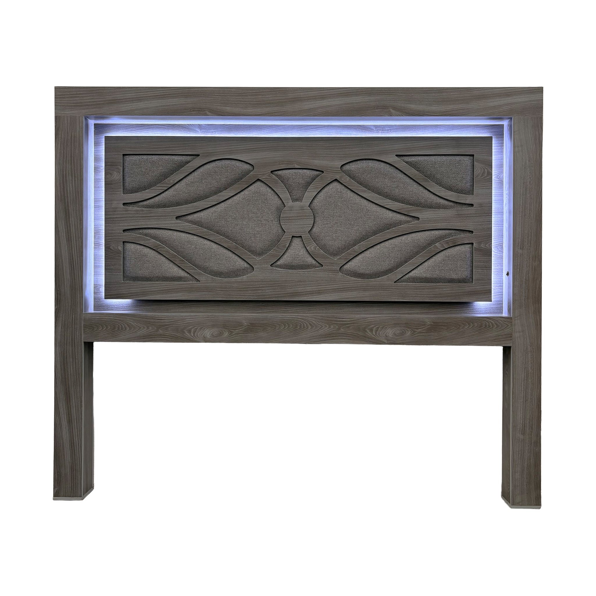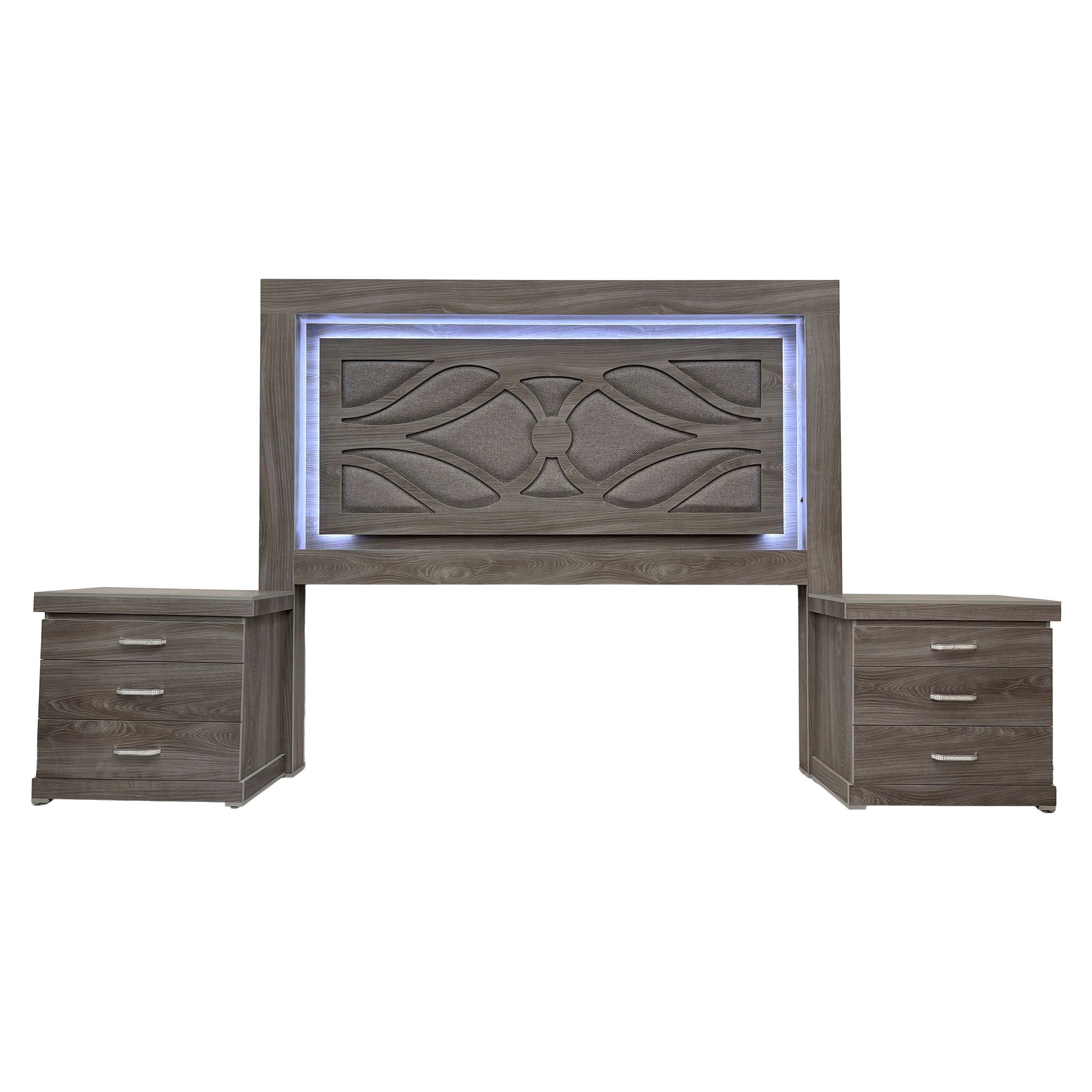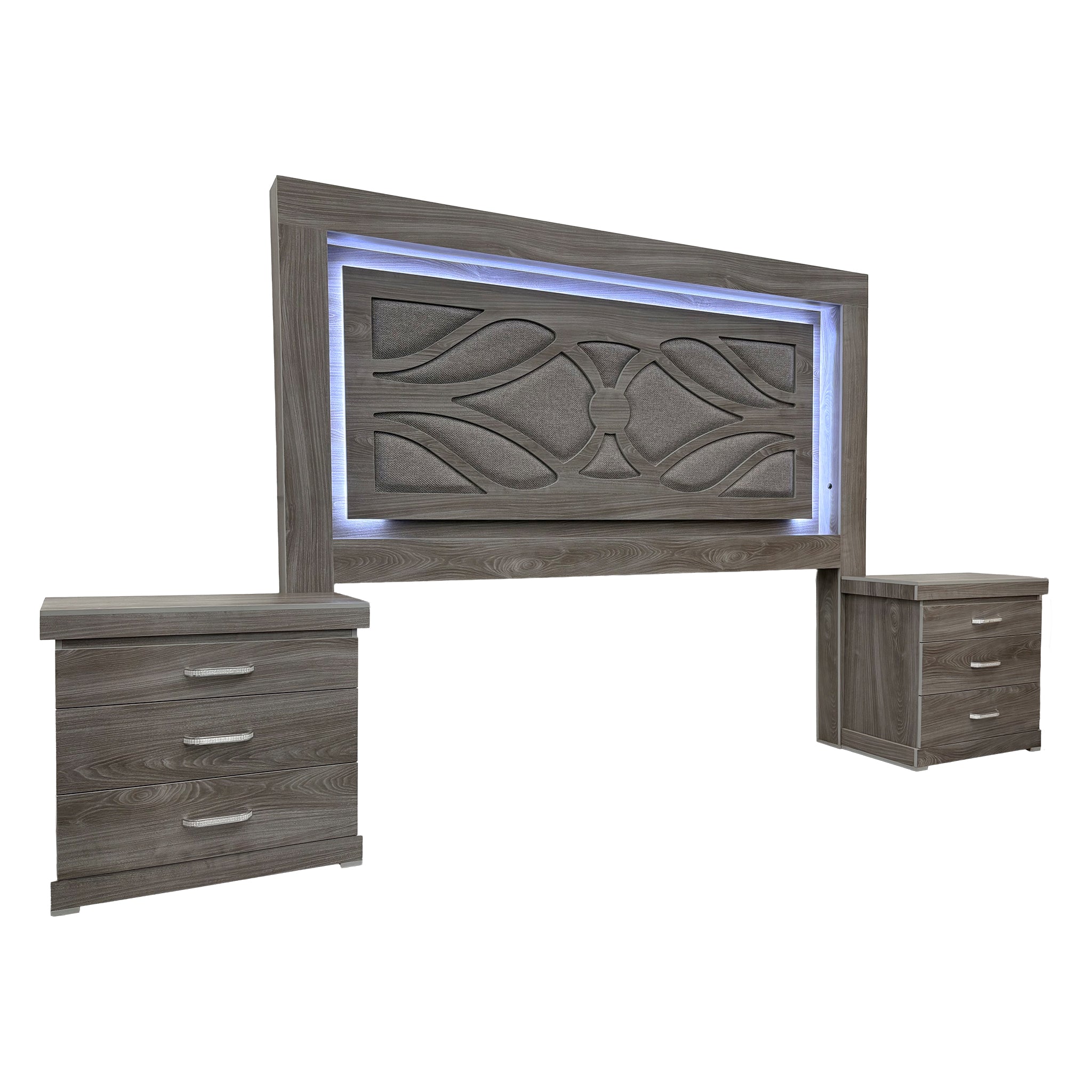 La cabecera tapizada en lino gris cuenta con iluminación integrada, creando un ambiente acogedor. Sus burós son retráctiles, y uno de ellos incluye cargador para celular, ideal para mantener tu espacio moderno y práctico.