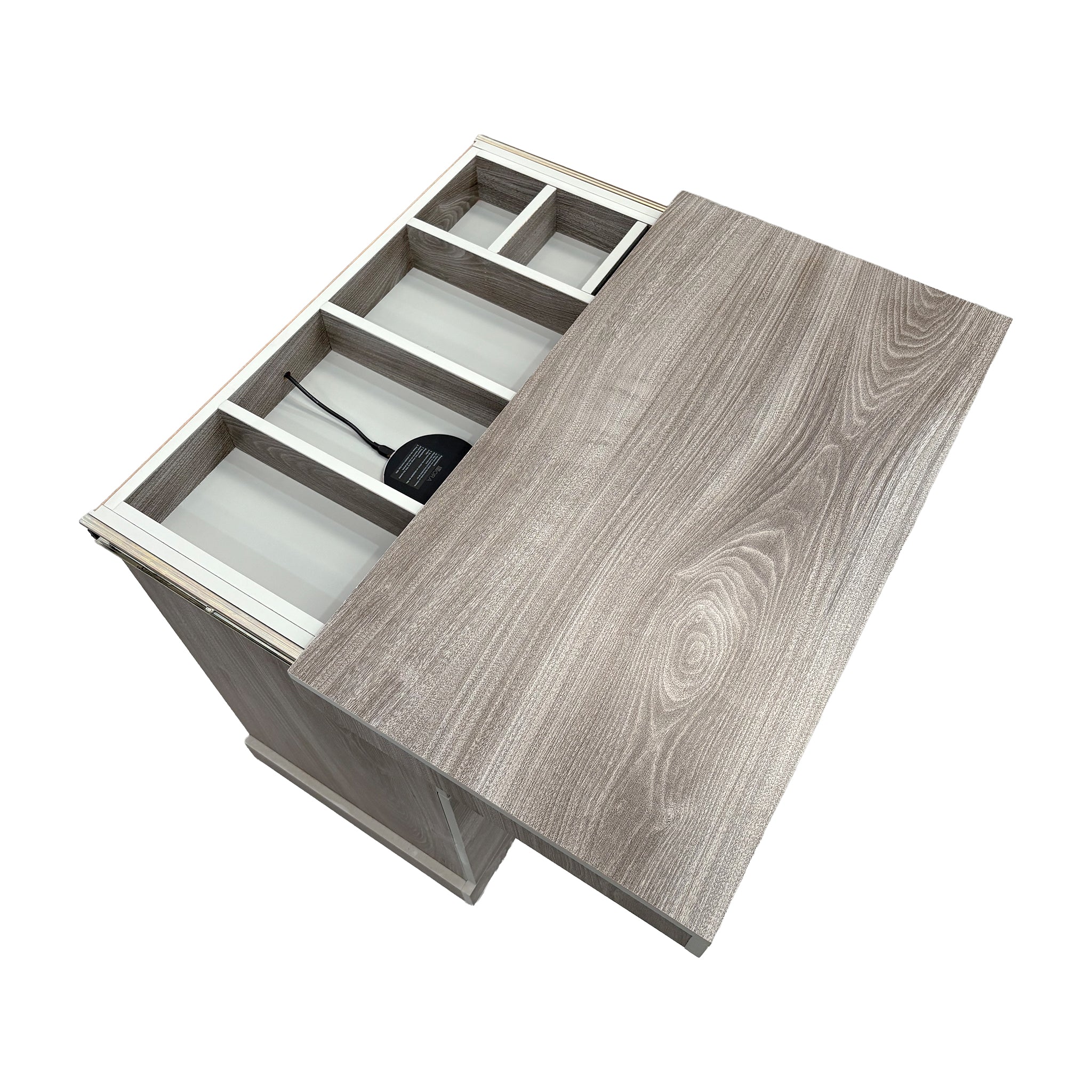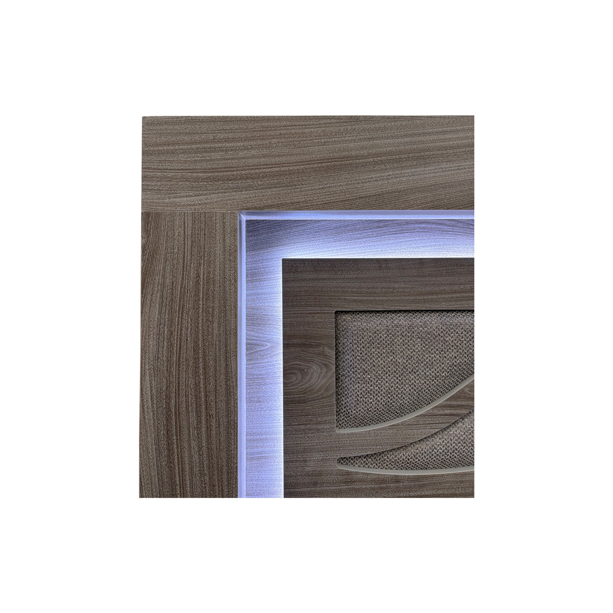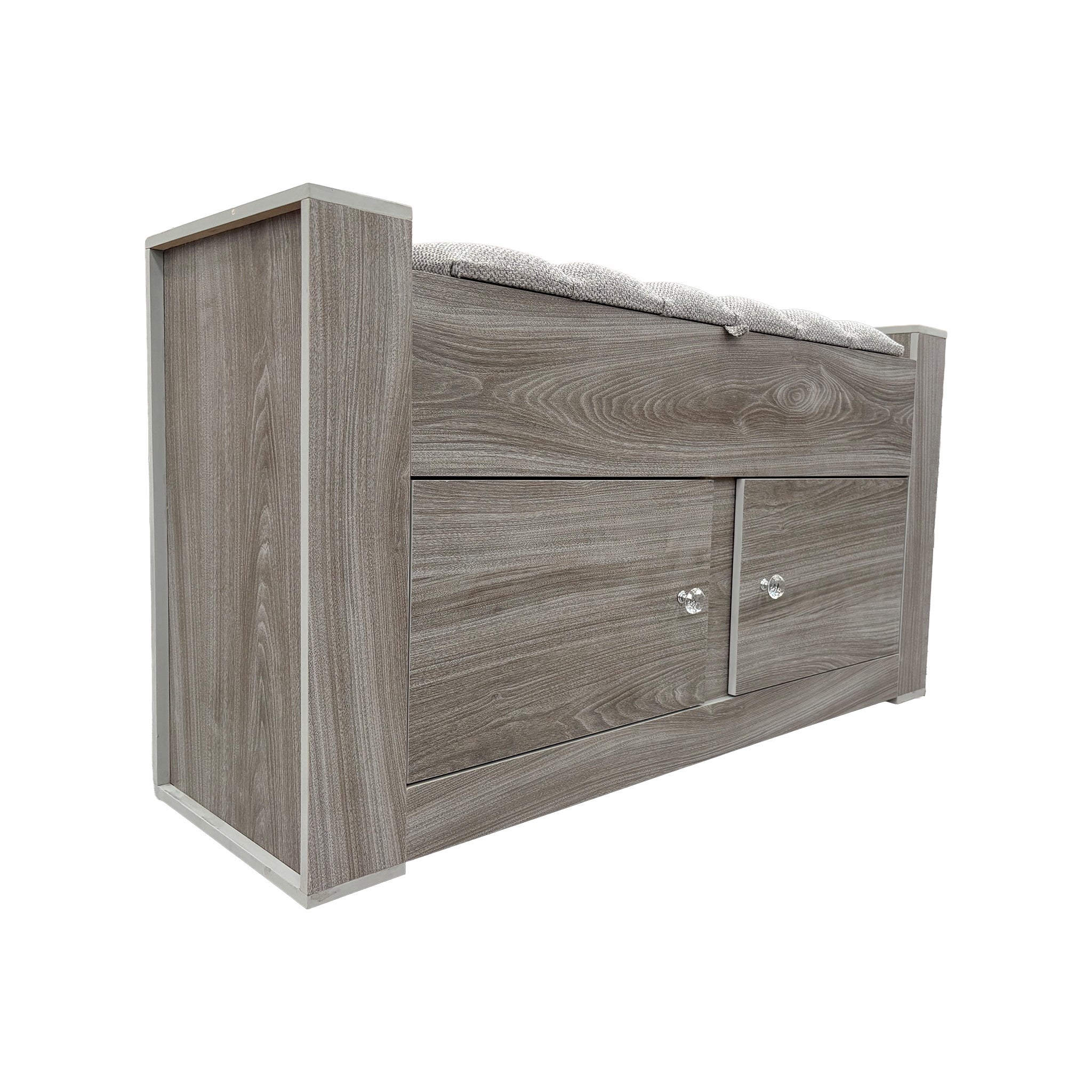 La cabecera tapizada en lino gris cuenta con iluminación integrada, creando un ambiente acogedor. Sus burós son retráctiles, y uno de ellos incluye cargador para celular, ideal para mantener tu espacio moderno y práctico.