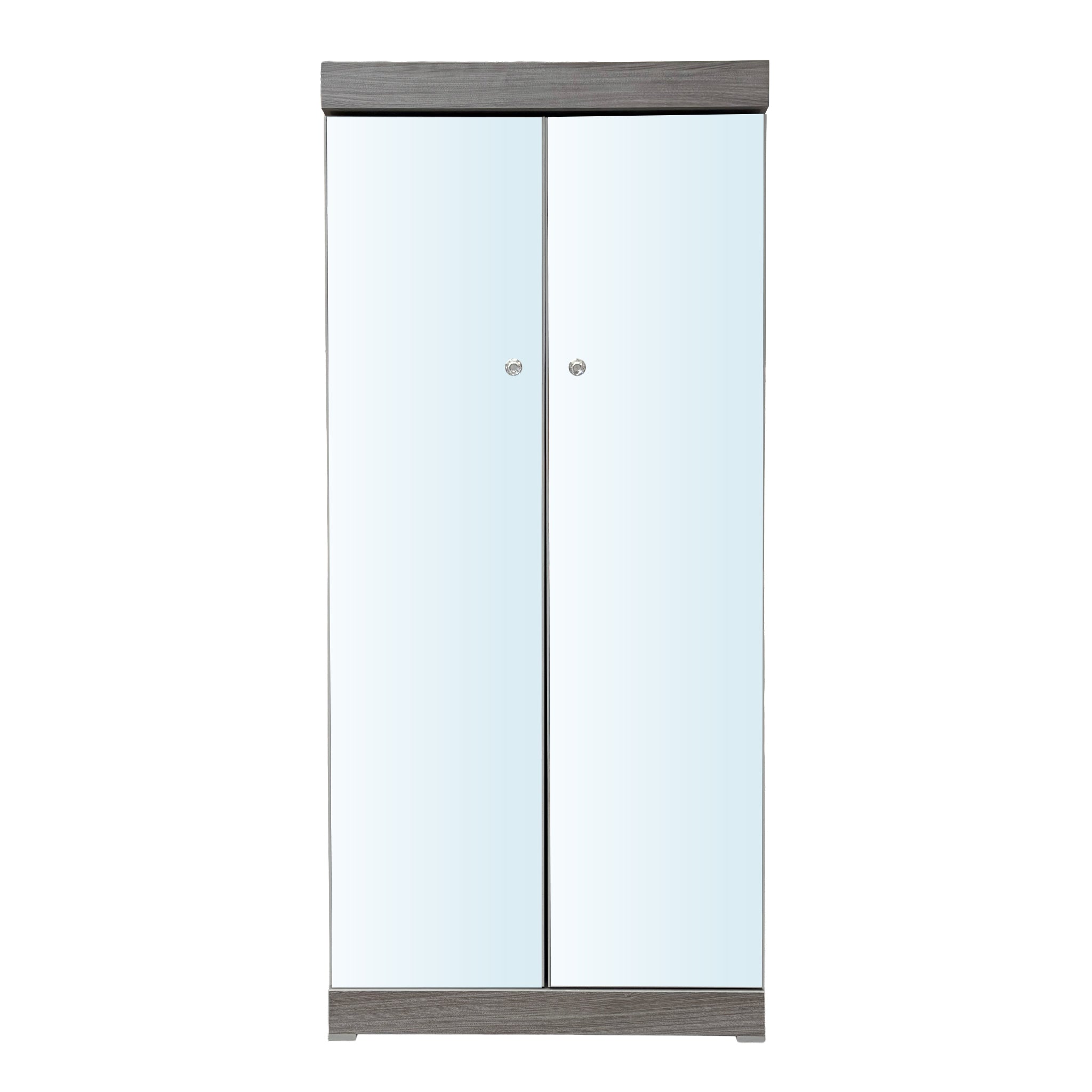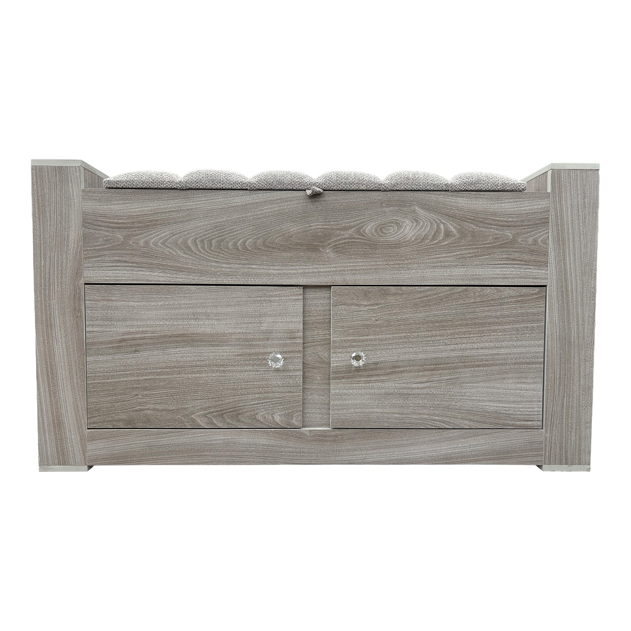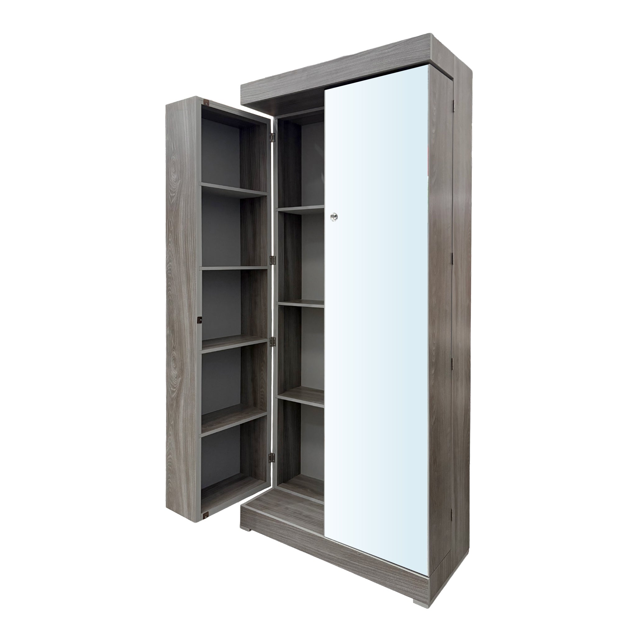 Además, incorpora un pequeño ropero con puertas de espejo, que en su interior cuenta con repisas para mayor almacenamiento. El pie de cama ofrece también un espacio útil para guardar objetos de forma discreta.