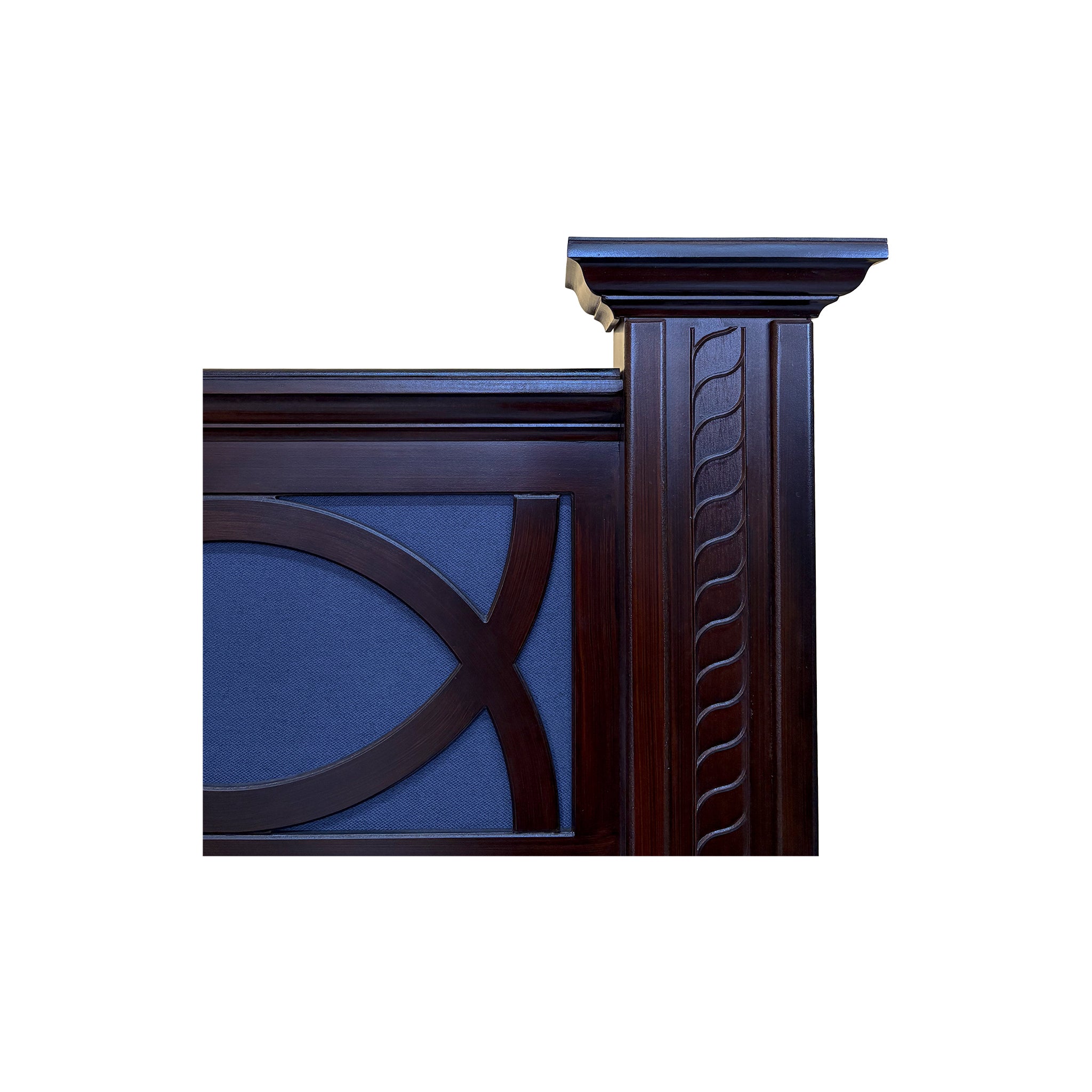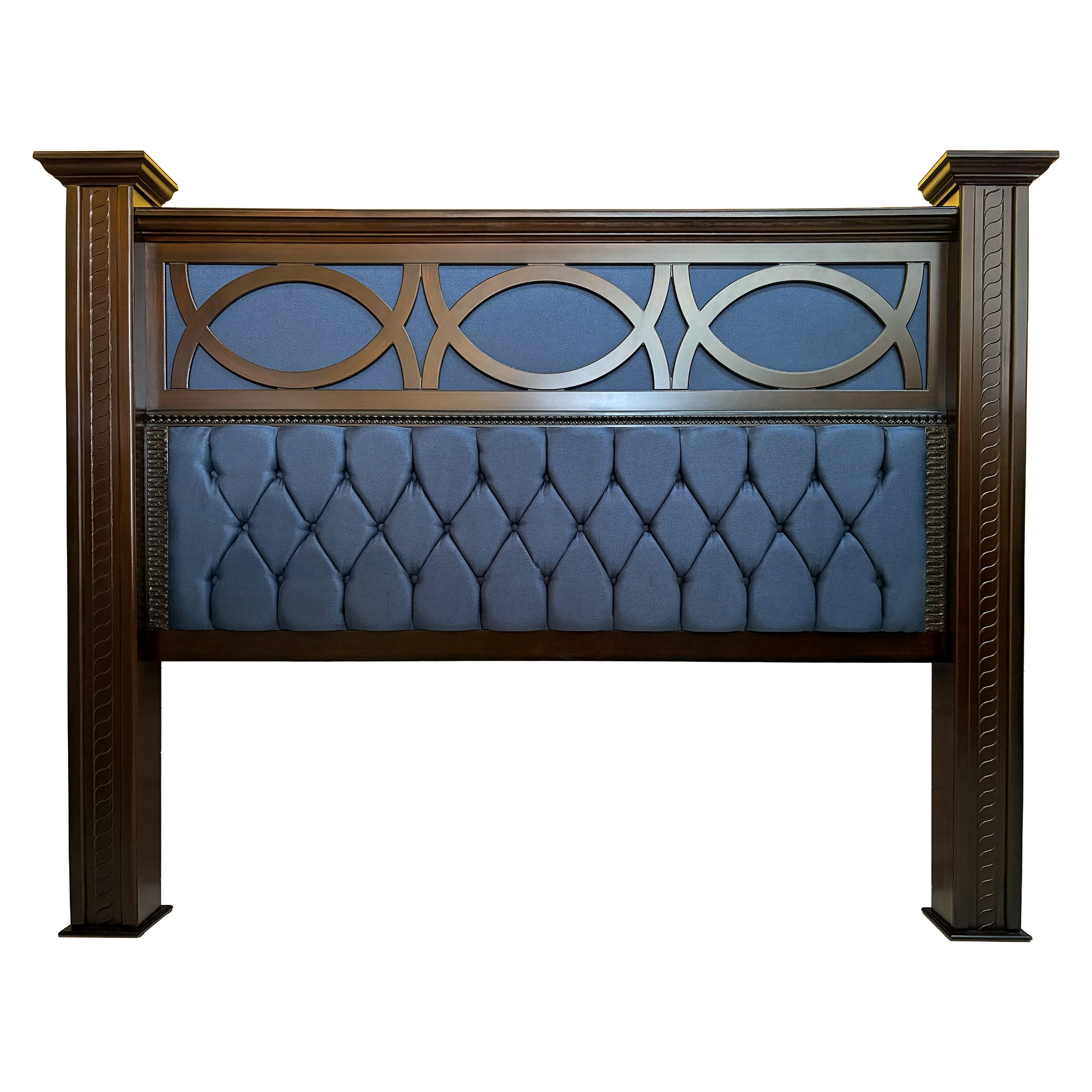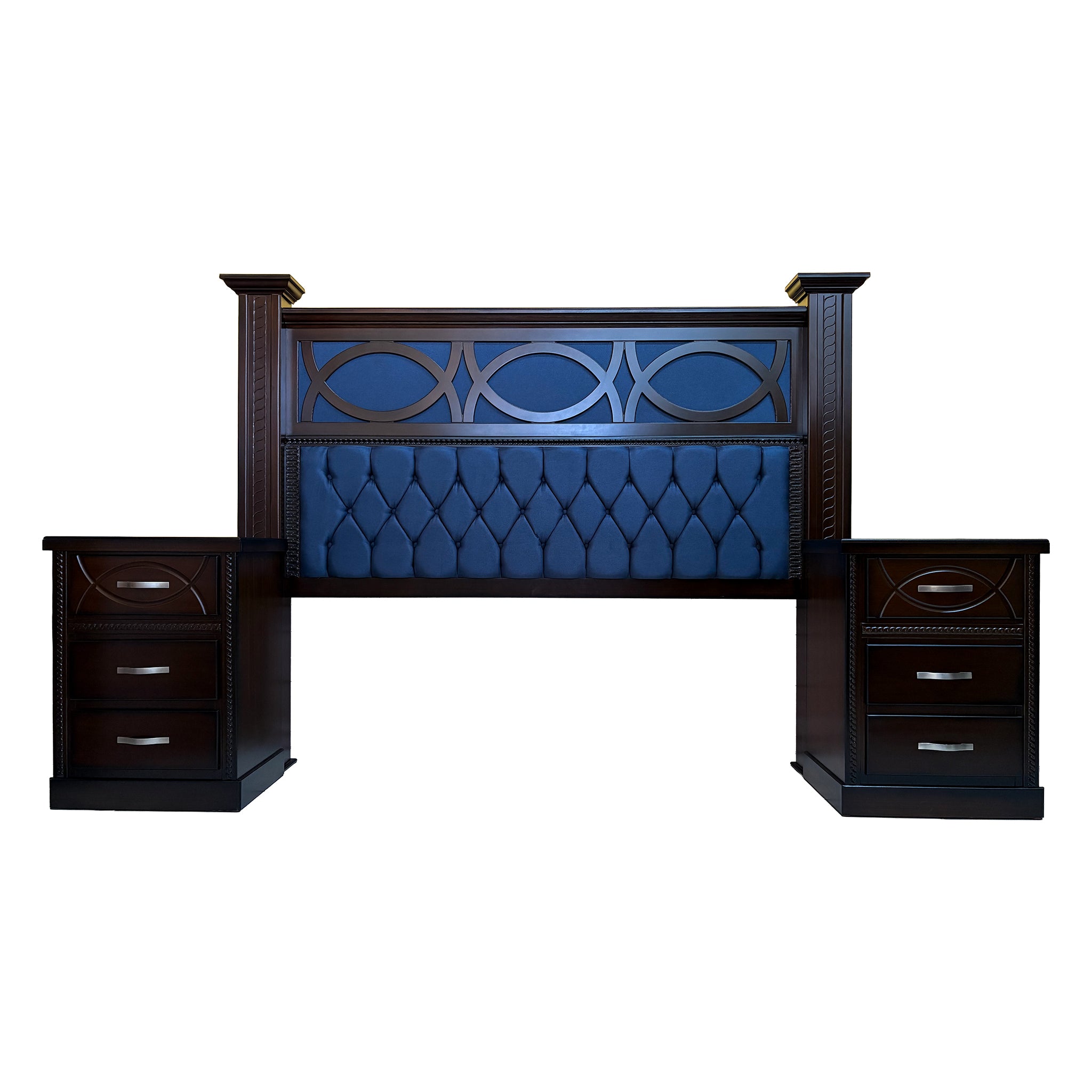 La cabecera está tapizada en lino azul, aportando un contraste elegante y un efecto visual de luminosidad. El par de burós presenta una altura superior a la habitual, lo que brinda mayor presencia y funcionalidad, mientras que el tocador complementa el conjunto con los mismos detalles decorativos grabados, creando una armonía visual refinada.