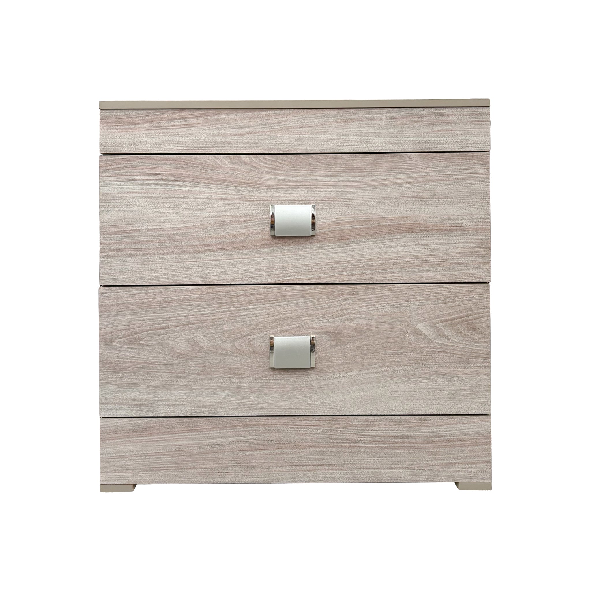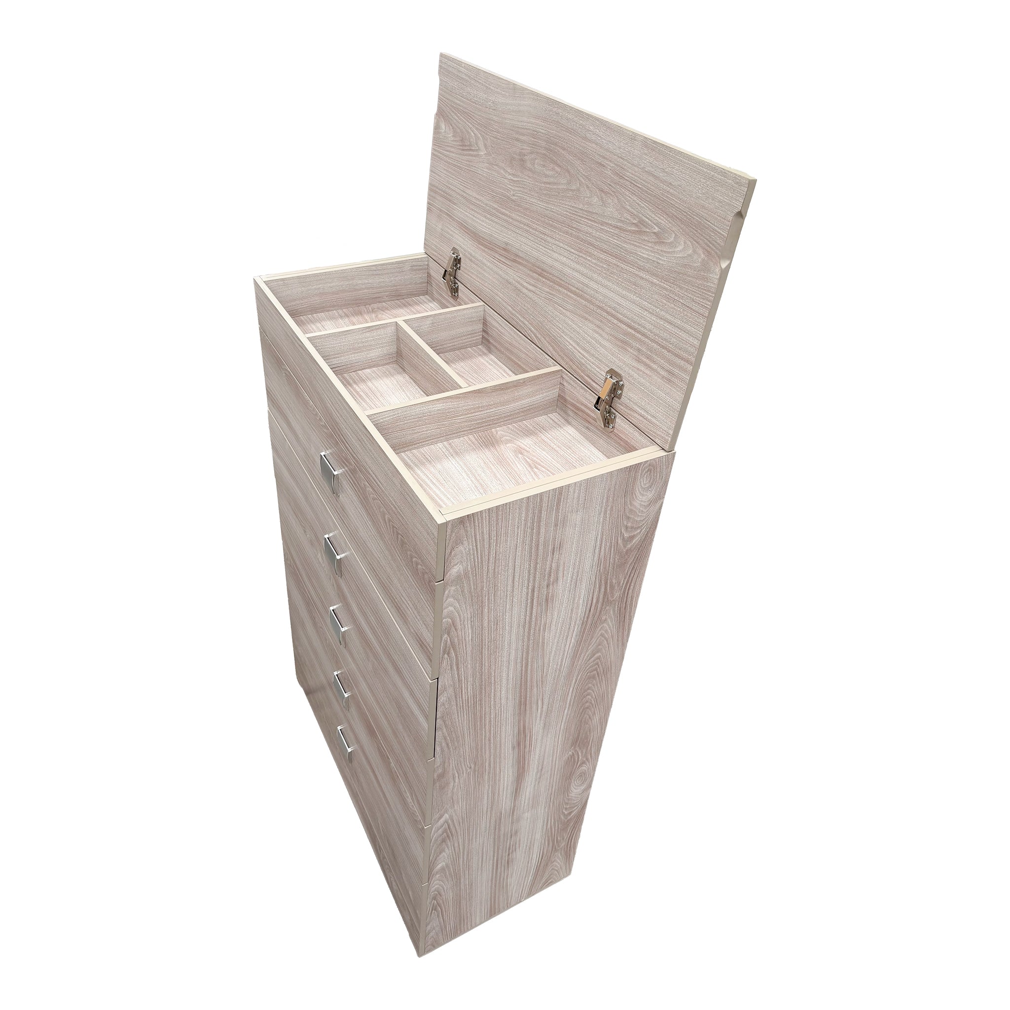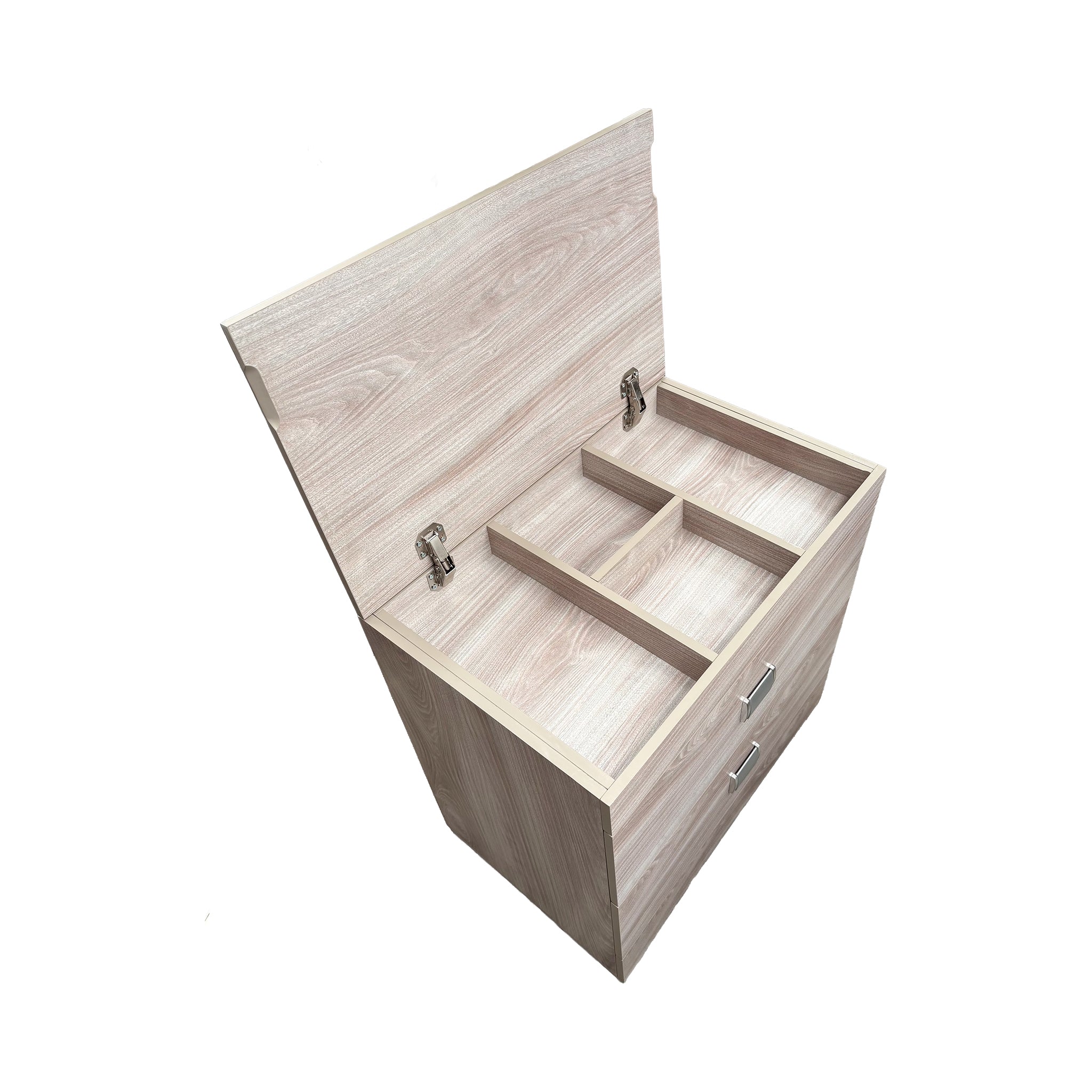 Los burós y la cajonera están diseñados con cubiertas elevables que revelan secreteros ocultos, ideales para guardar objetos personales como joyería o artículos pequeños. El espejo es fijo, con repisas laterales integradas para mayor funcionalidad. El pie de cama está dividido en dos compartimentos, permitiendo organizar ropa de cama y calzado por separado.