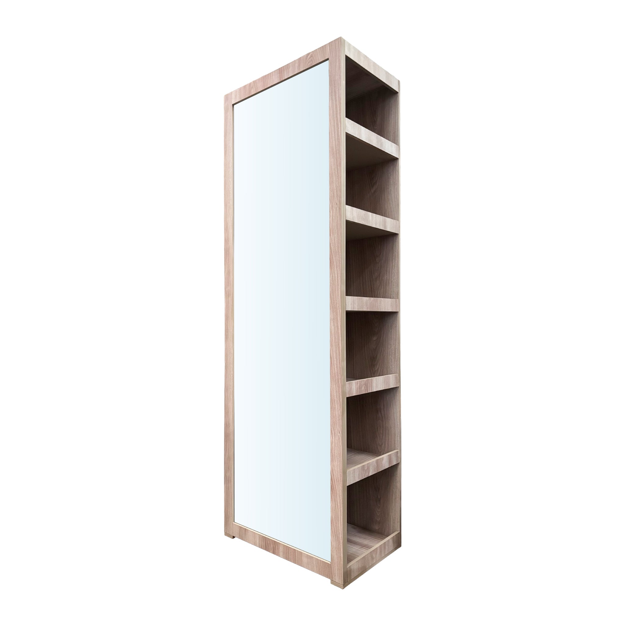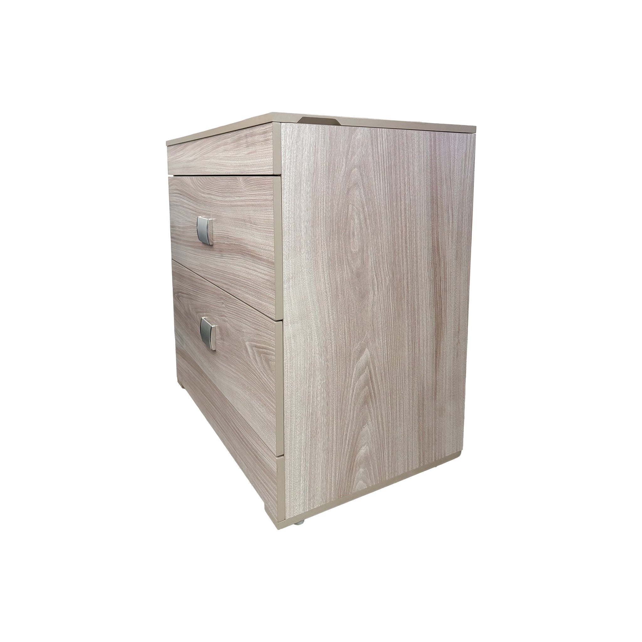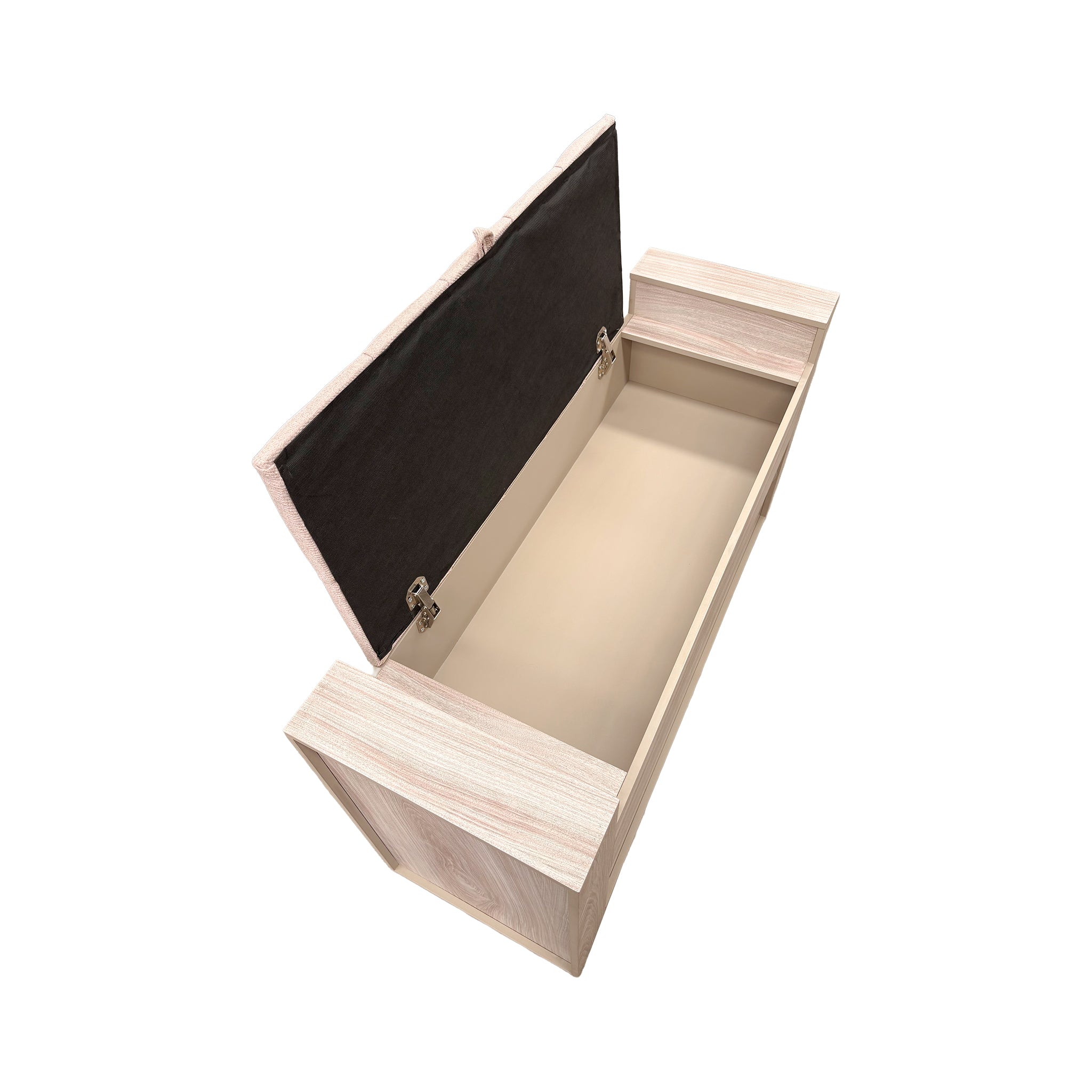 Los burós y la cajonera están diseñados con cubiertas elevables que revelan secreteros ocultos, ideales para guardar objetos personales como joyería o artículos pequeños. El espejo es fijo, con repisas laterales integradas para mayor funcionalidad. El pie de cama está dividido en dos compartimentos, permitiendo organizar ropa de cama y calzado por separado.