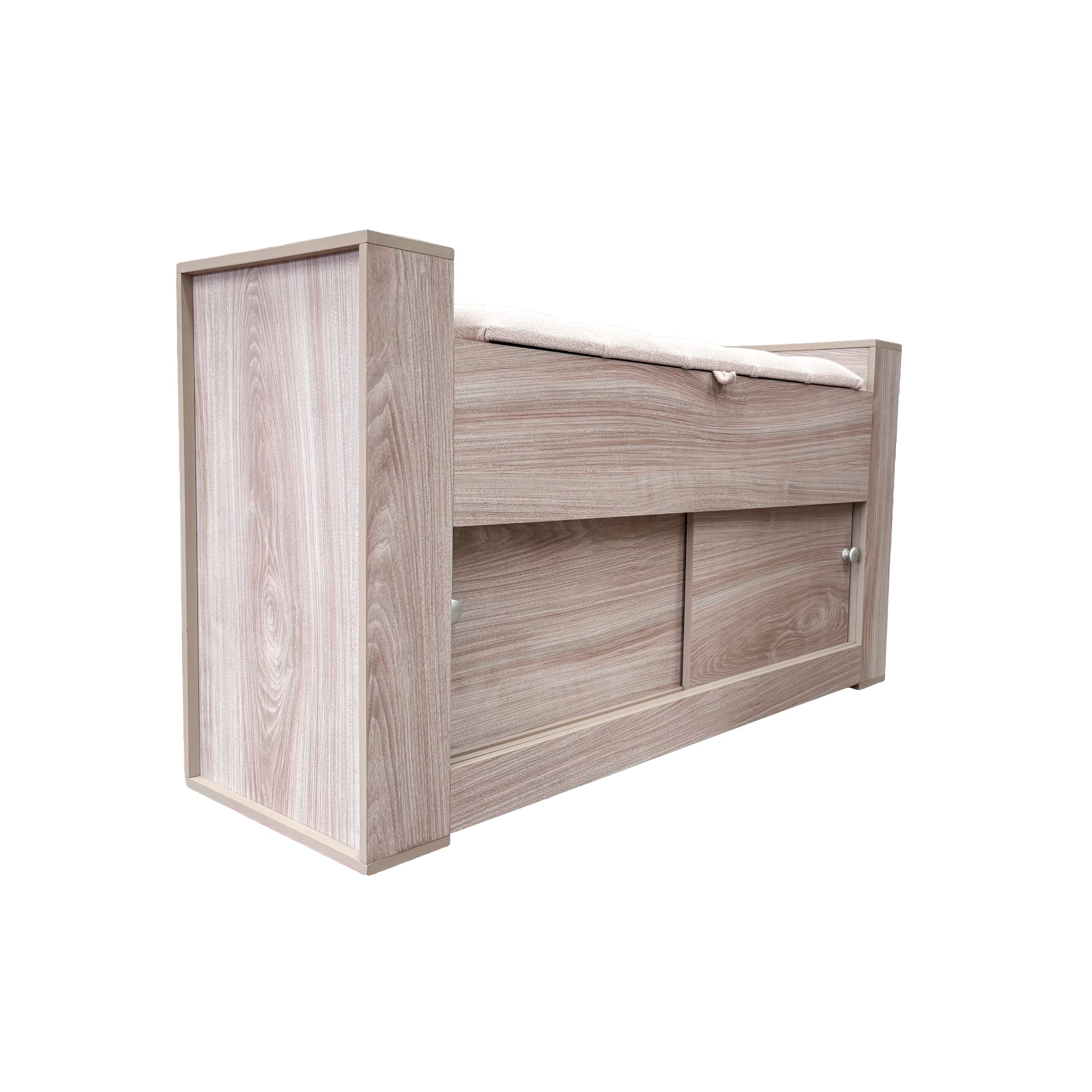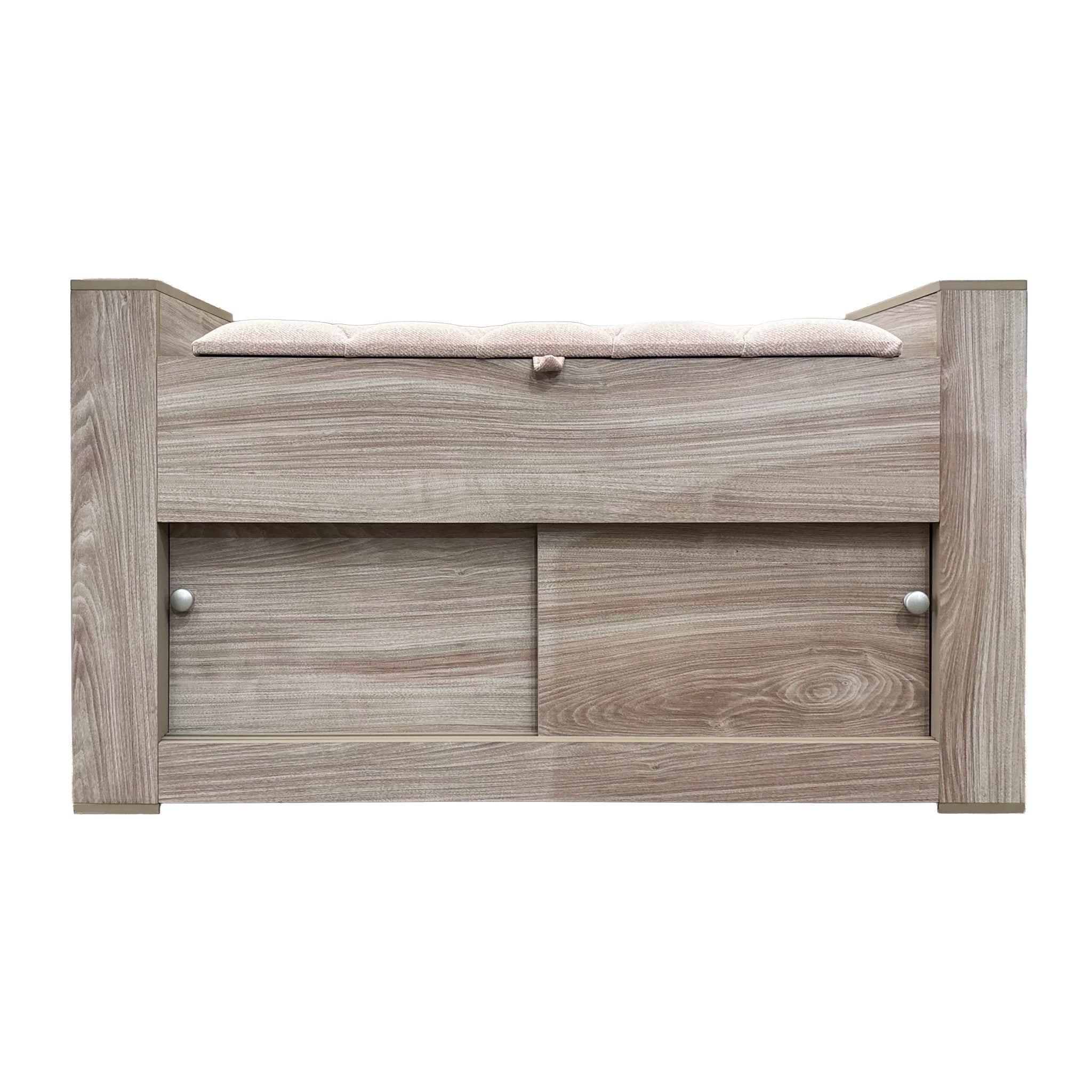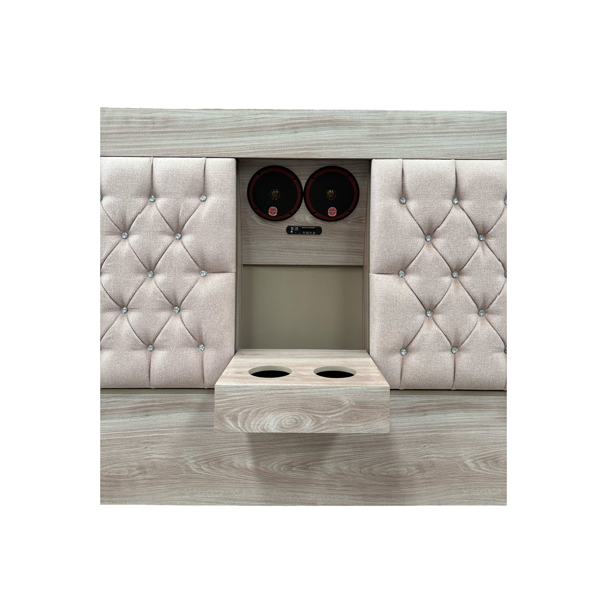 Su cabecera tapizada incluye un sistema de audio con conexión Bluetooth, ideal para disfrutar música desde tu dispositivo. Además, cuenta con porta vasos y compartimiento de almacenamiento oculto, accesible mediante un mecanismo abatible.