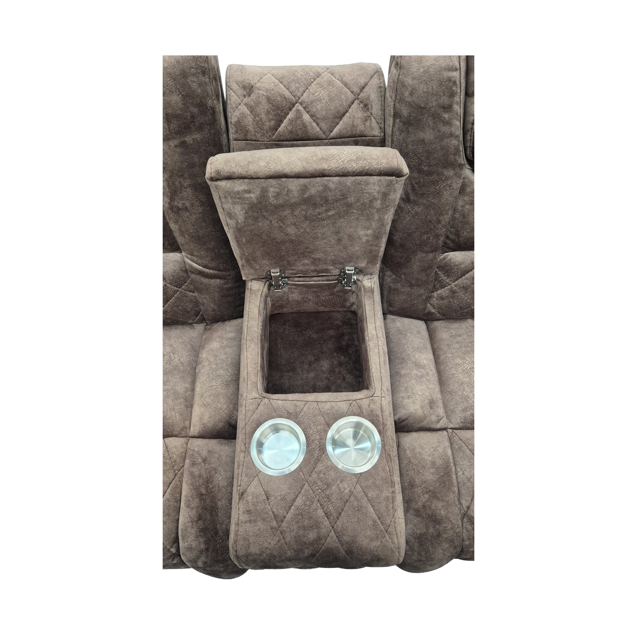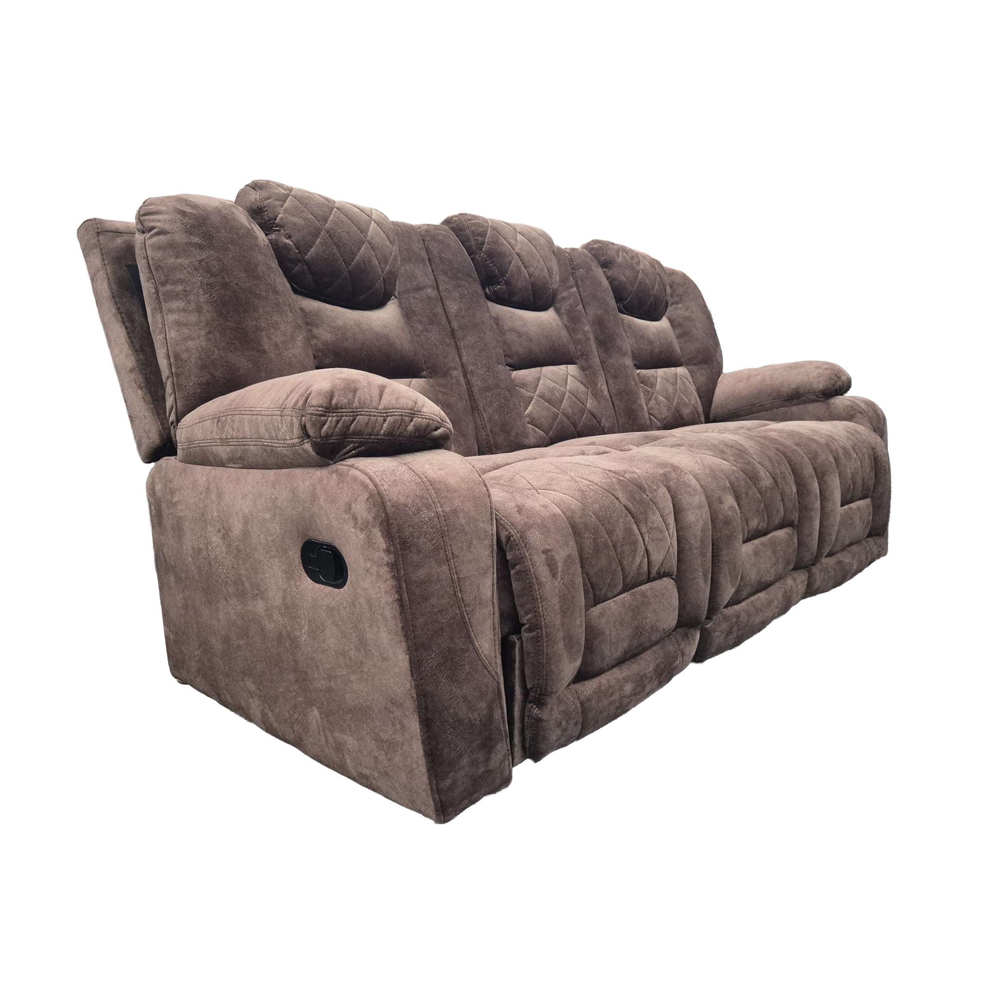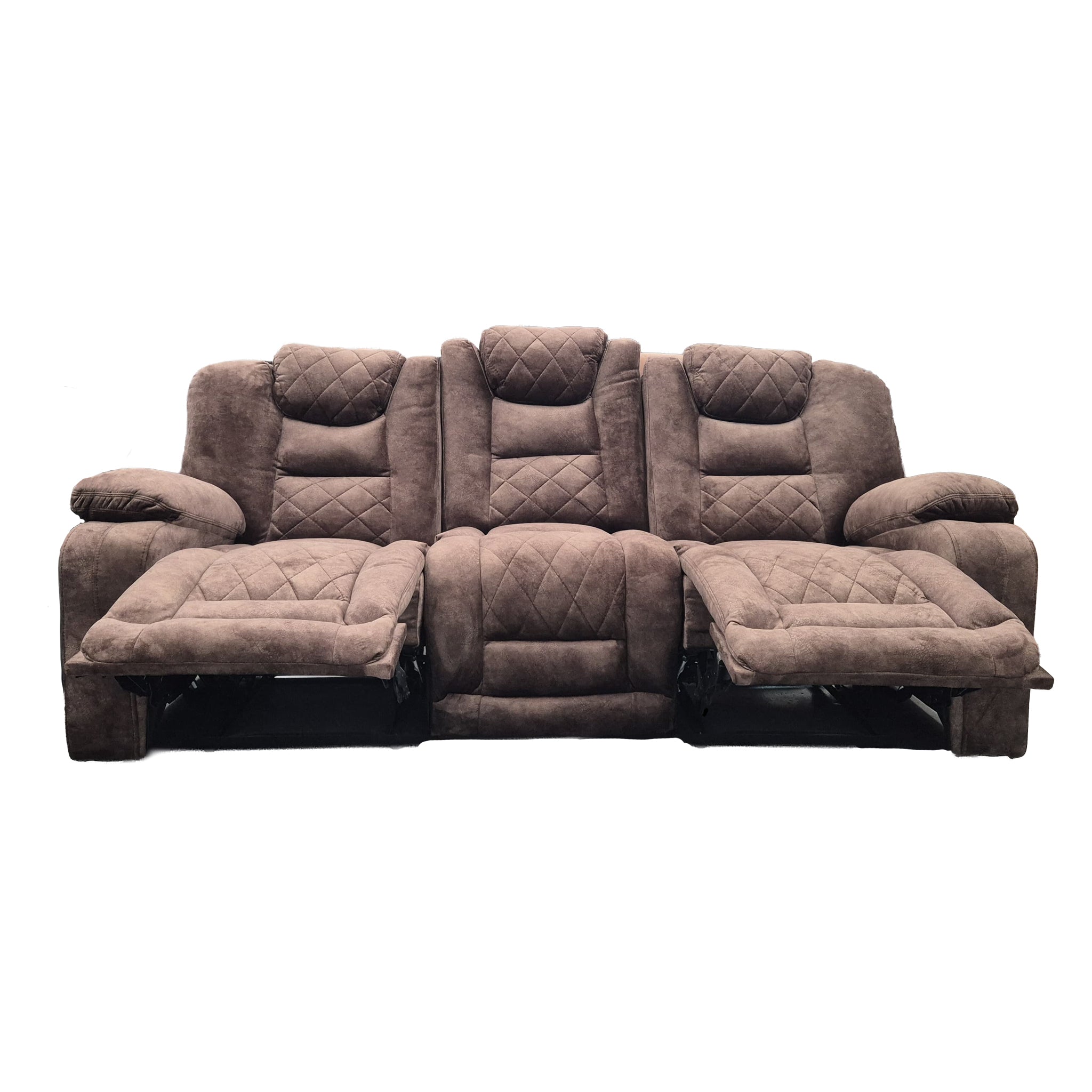 La Sala Phoenix esta conformada por un sofá triple, loveseat y sillón individual, tapizada en tela Bernard 293, suave al tacto y de fácil mantenimiento. Incorpora 5 mecanismos reclinables manuales que permiten mayor confort, además de un gabinete central con portavasos. Su diseño acolchado con costuras decorativas aporta un estilo moderno y funcional.