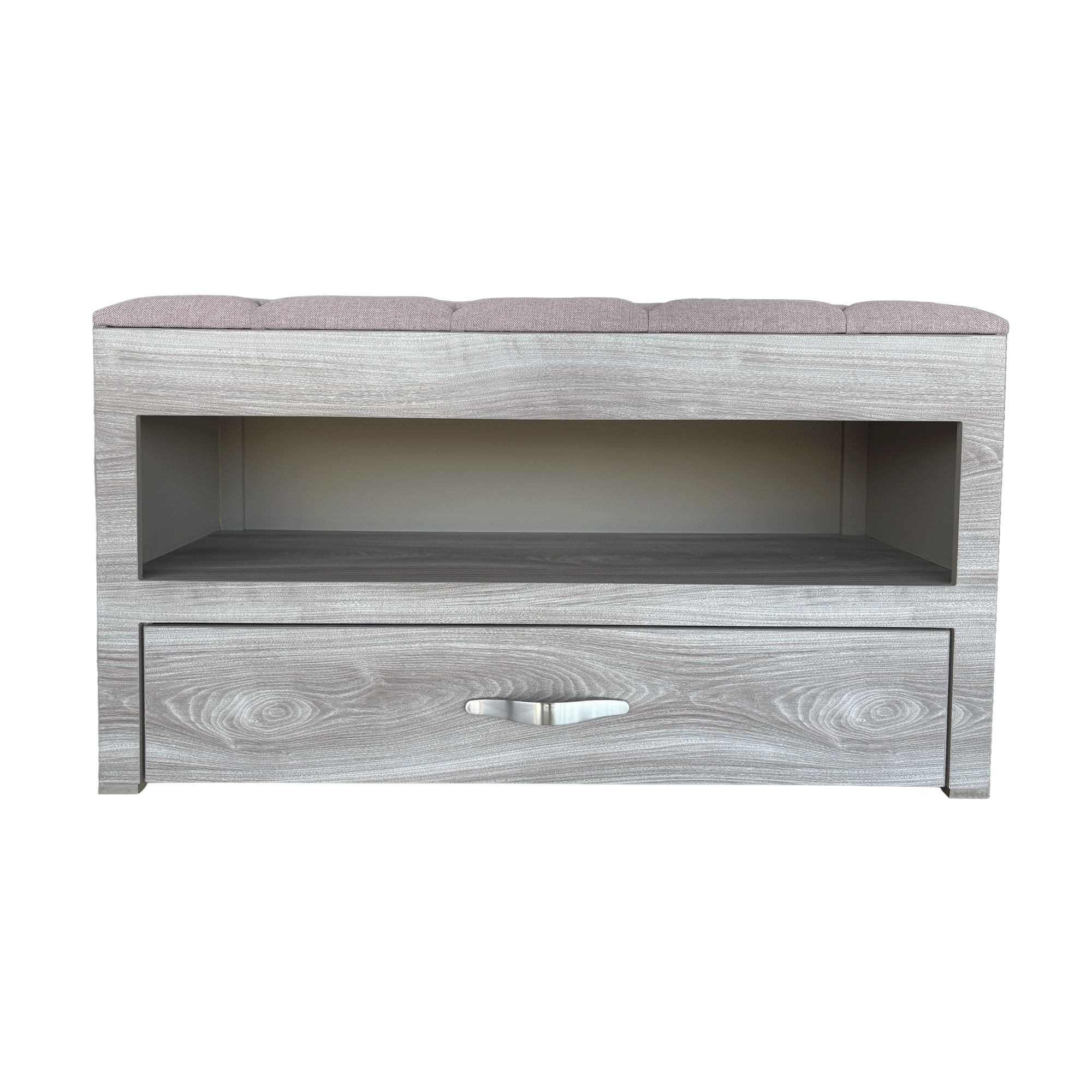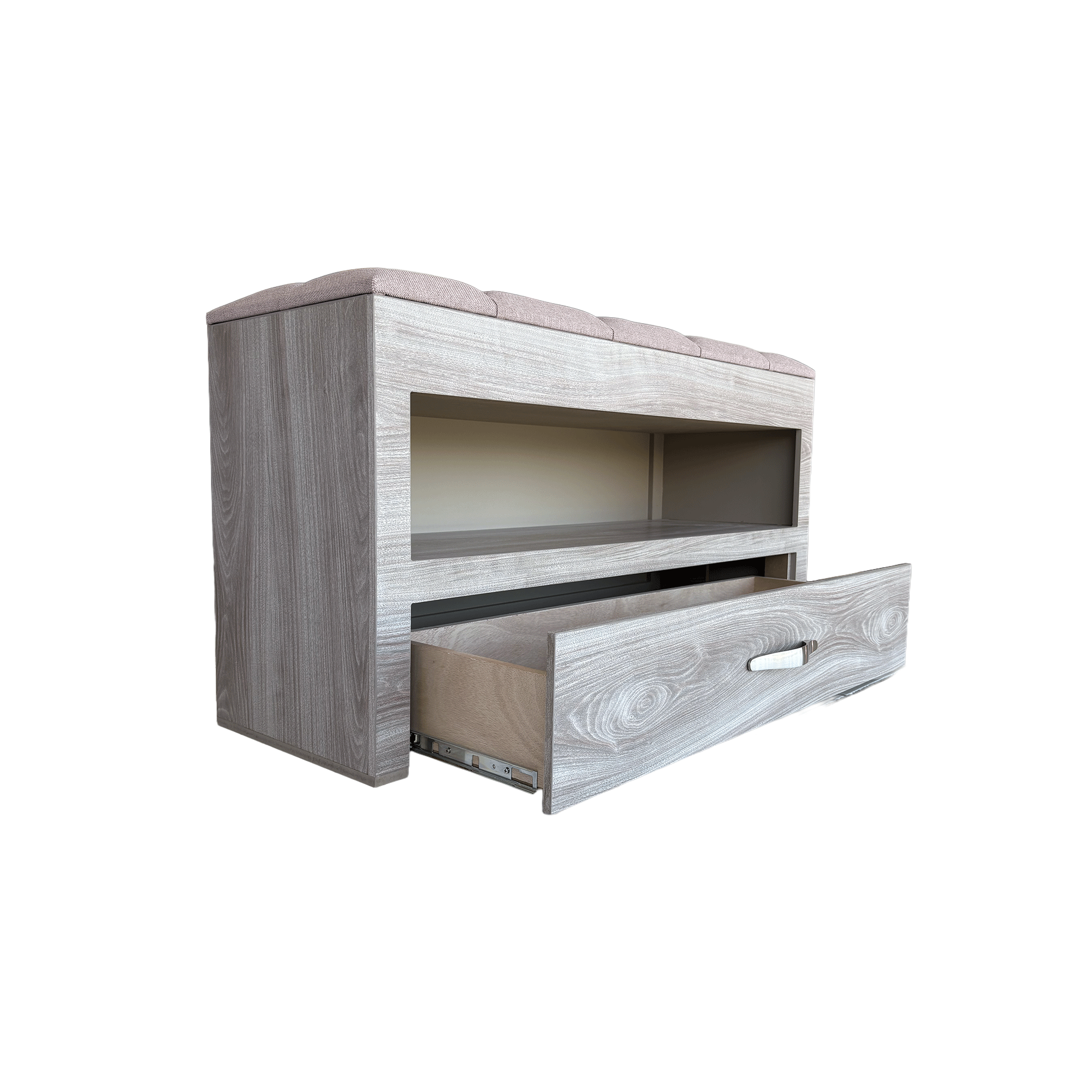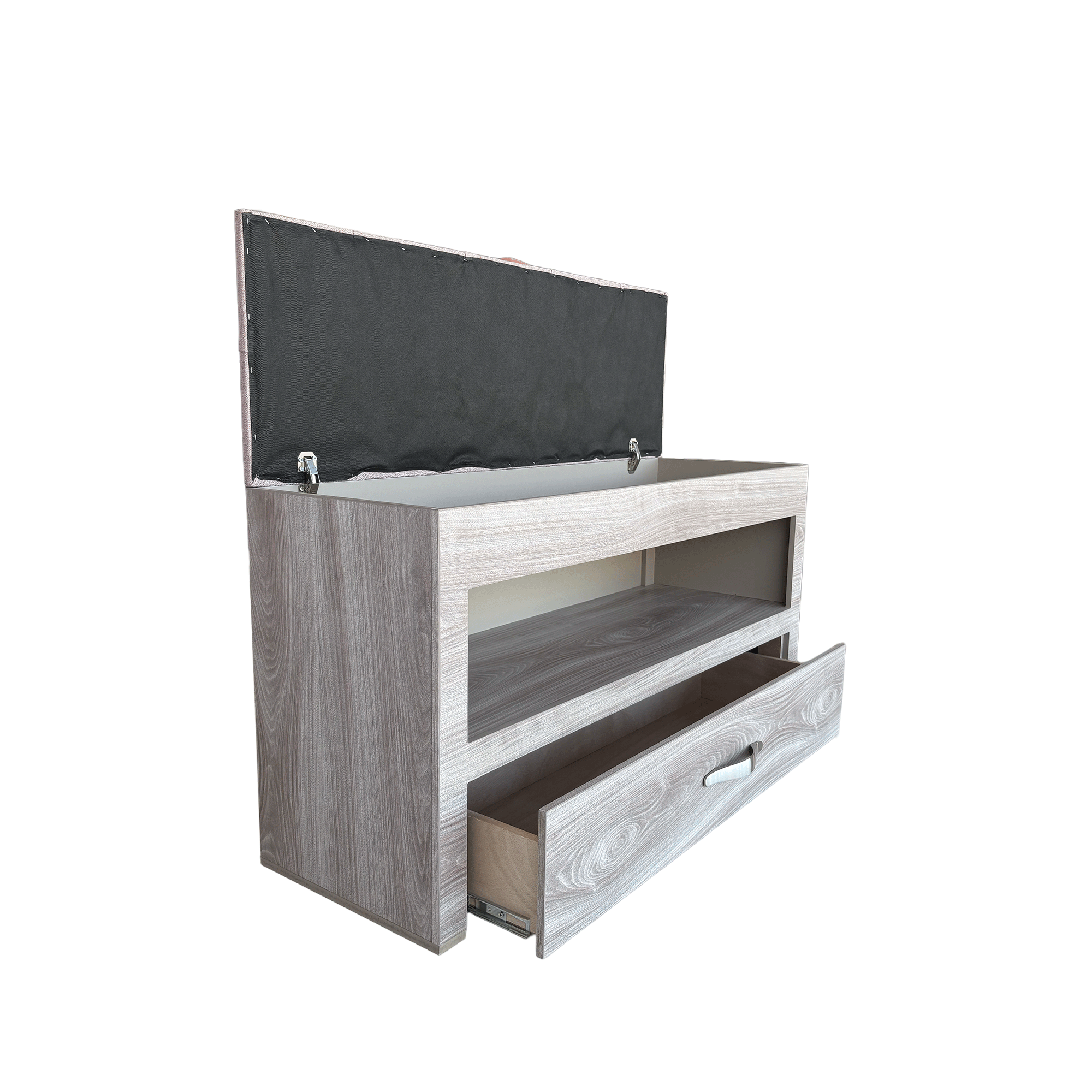Pie de cama con gran capacidad de almacenamiento, ideal para aprovechar el espacio.