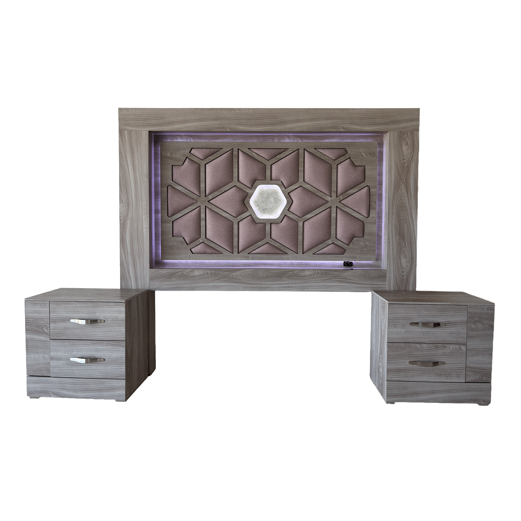 Su cabecera cuenta con iluminación LED y una pieza central de ónix natural, creando un ambiente relajante ideal para descansar.