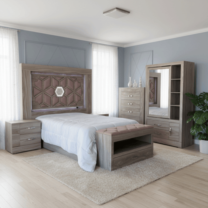 La Recámara Alisson es la combinación perfecta de estilo, organización y confort. Fabricada en acabado color marrón con detalles en tapiz lino tono palo de rosa, ofrece un diseño contemporáneo que transforma cualquier habitación en un espacio cálido y sofisticado.